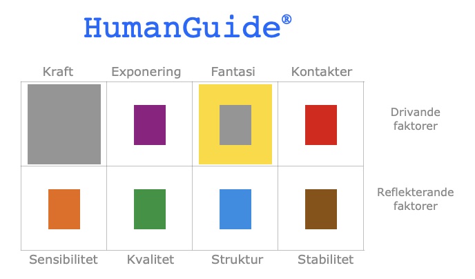 Som du ser så domineras hennes personlighet av Kraft och Fantasi. Den kombinationen kan ge fartblindhet och utmattningsdepression. Det var Fantasi som hon verkligen inte fick så mycket utlopp för i sitt jobb som kärnkraftsingenjör. I övrigt var hon ganska allsidig, som kan ha berott på att hon gick in för att duga, genom att anpassa sig. Till slut blev det för illa för Fantasi, så hon sa upp sig.